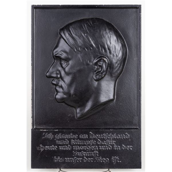 Large Iron plaque showing a side profile of Adolf Hitler with a quote at the bottom of the plaque translated as, 'I believe in Germany, and figh...