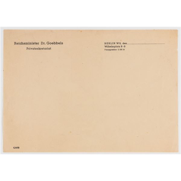 Scarce stationery with letterhead for the private secretariat of Reichsminister Dr. Joseph Goebbels (1897-1845). Blank stationery with the address of