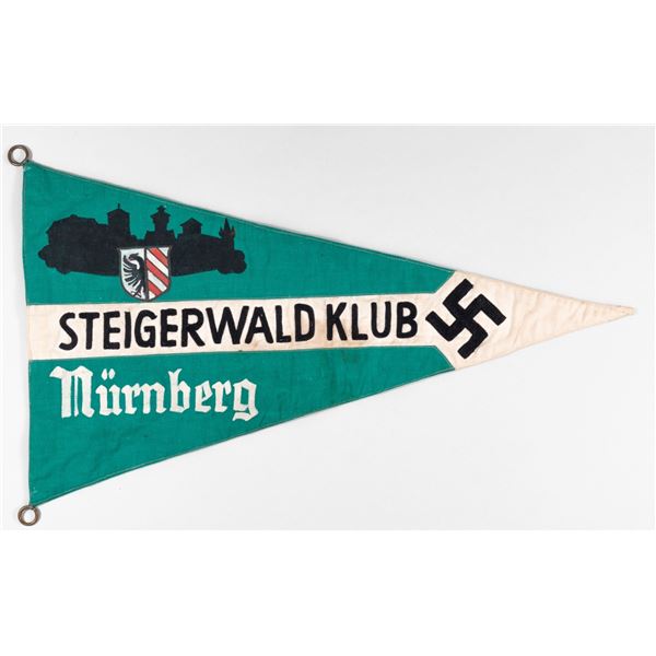 WWII German pennant for the Steigerwald Club in Nuremberg, city of the Reich Party Rallies. The green and white pennant is embroidered with the name o
