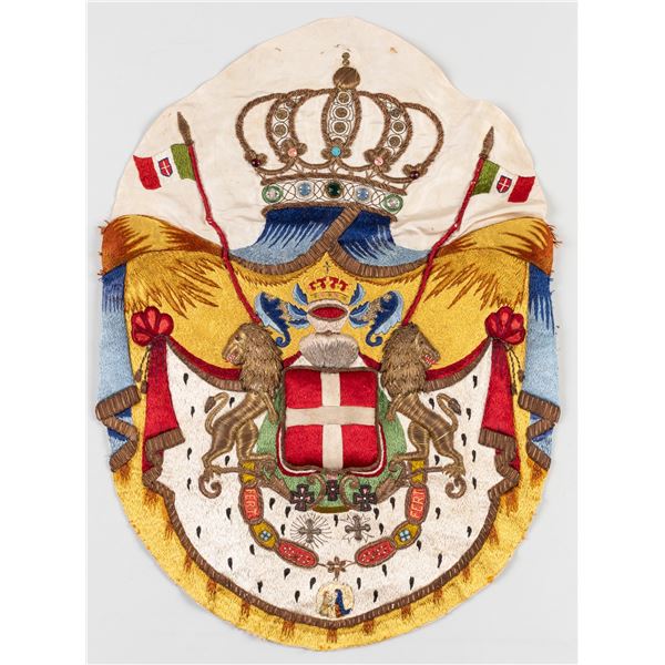 Excellent embroidered Italian royal coat of arms of the Kingdom of Italy. Using embroidery thread and bullion wire, the center bears two lions holding