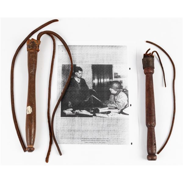 Two leather whips with 15.5- and 4.5-inch long strips, a approx. 10-inch wooden handle, appropriated by concentration camp guards for abusing concentr