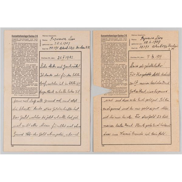 Two letters from the Dachau concentration camp written by Leon Poprawa, born 28.6.1909, prisoner number 28391, Block 28/1, Dachau 3K. Three page lette