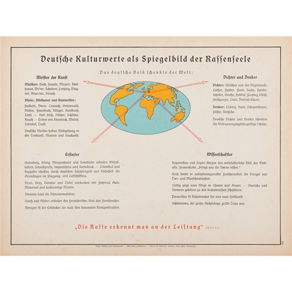 German WWII teaching poster titled 'German cultural values as a mirror image of the racial soul' and what the 'German people gifted the ...