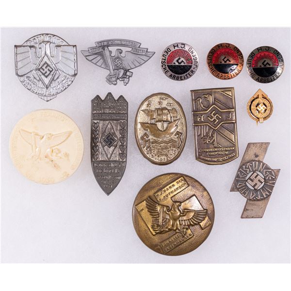 Group of 12 Hitler Youth badges and tinnies, includes three HJ Deutsche Arbeiter Jugend badges, 1st Franken Ostmark meeting in Nuremberg 1933 badge, G
