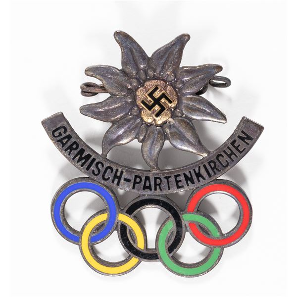 WWII Winter Olympics Edelweiss pin 'Garmisch-Partenkirchen', host city of the games, with the five Olympic rings. Maker's mark on the ve...