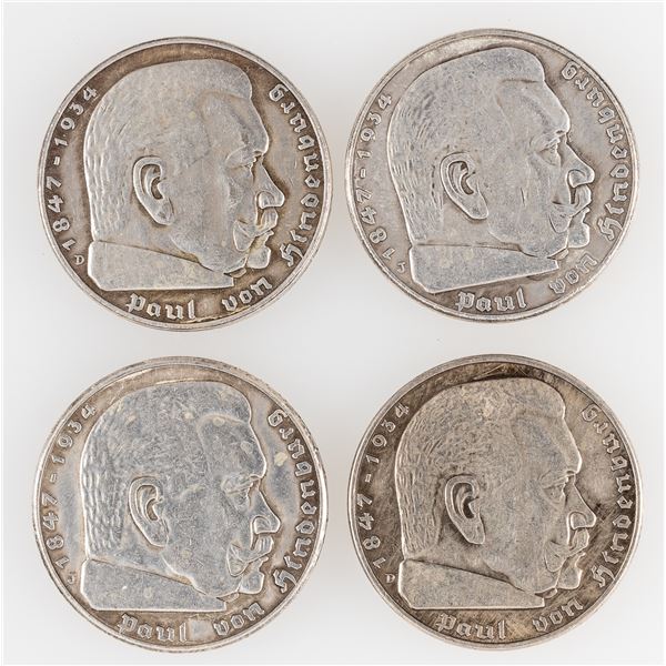 Four Third Reich Hindenburg 5 Mark silver coins with cameo of Paul von Hindenburg on obverse. Reverse shows a Nazi eagle clutching an oak leaf wreath