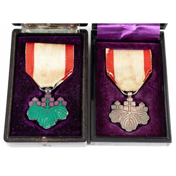 Two cased Japanese Order of the Rising Sun medals for the 7th and 8th Classes. Medals show paulownia leaf attached to red and white ribbons with metal