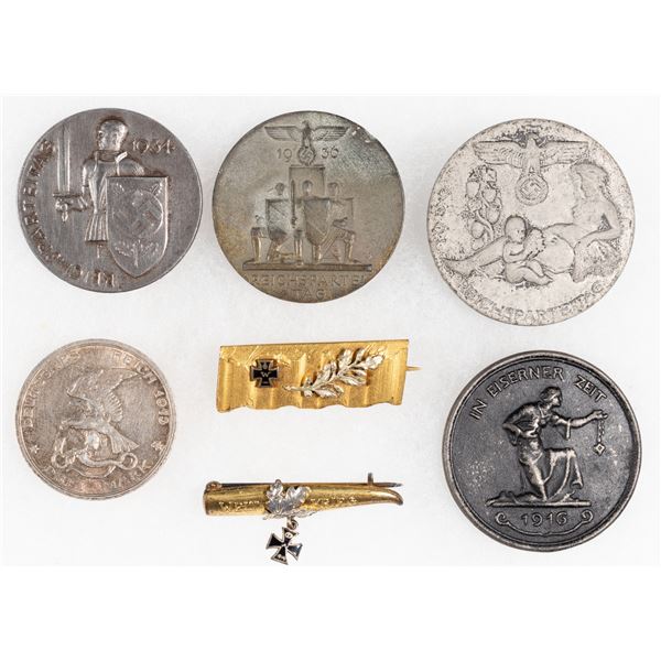 Group lot of seven pieces, includes Gold For Iron War medal, 1913 Prussian 3 Mark coin, three Reichsparteitag tinnies for 1934, 1936, and 1939, and tw