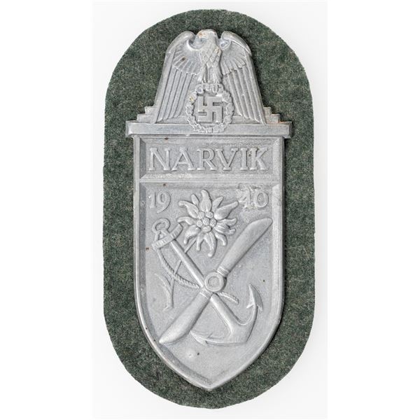 GERMAN WWII SILVER NARVIK SHIELD 1940 German 1940 Narvik sleeve shield in silver on gray wool backing, with partial paper backing.