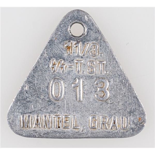 German WWII aluminum clothing tag for a gray SS overcoat for members of the 3. SS-Totenkopfstandarte Thuringia, Buchenwald. Triangular, non-magnetic t