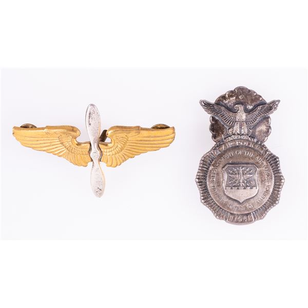 Lot of two US Air Force badges. First, US Air Force Police badge, numbered 'H7548', marked on verso, 'Gov't Property', c-clasp p...