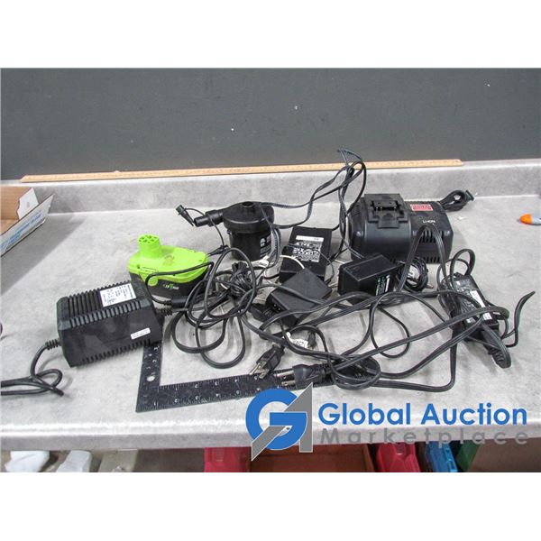 Assorted Chargers, Batteries and Air Pump