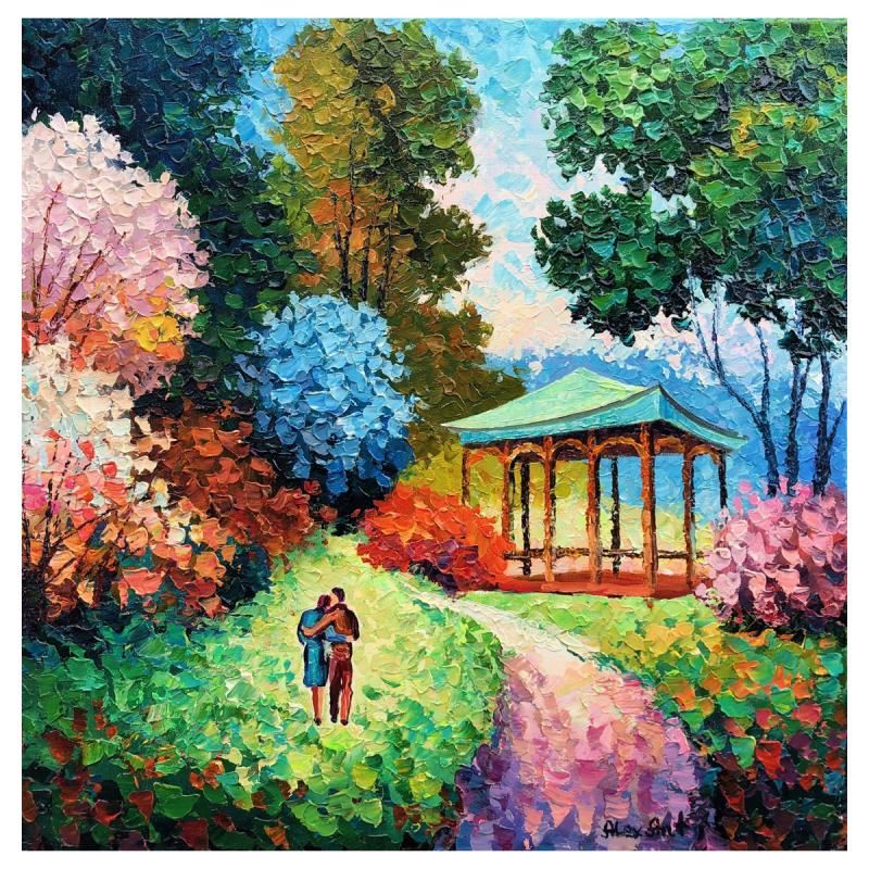 "September Romance" is an original oil painting on stretched canvas by Alexander Antanenka. Hand signed by the artist, the piece comes with a letter of authenticity. Measures approximately 20" x 20" (image). There may be scuffs on the edges and corners which would be concealed when framed.