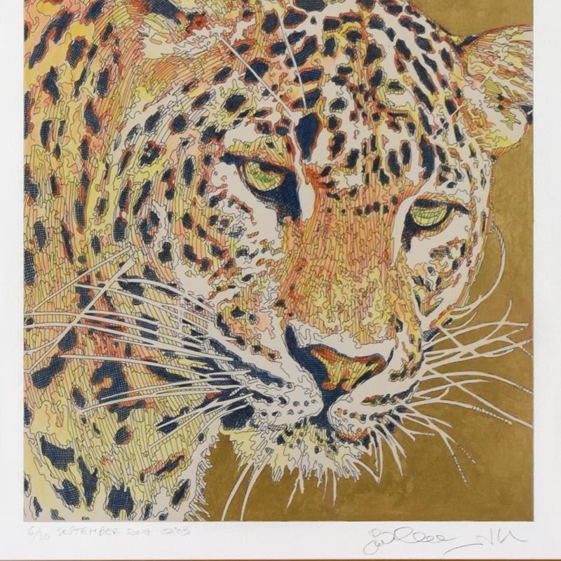 "September Song" is a limited edition hand colored etching on paper by Guillaume Azoulay. This piece is dated (2013), numbered 6/30 and hand signed by the artist. This piece comes custom framed. Includes Letter of Authenticity. Measures approx. 29" x 31" (frame), 13.5" x 16" (image).