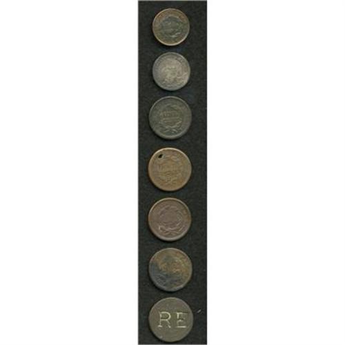 <B>Septet of Counterstamped U.S. Coins.</B></I> Silver/copper. A mixed lot of U.S. large cents, one half cent, and one Seated quarter, all with various counterstamps.<BR><BR><b>Shipping:</b> Coins & Currency (<a target="_blank" href="http://www.heritageauctions.com/common/shipping.php">view shipping information</a>)