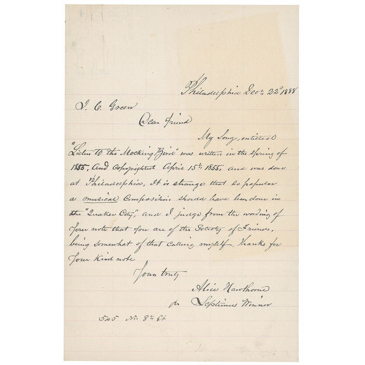 Nineteenth century songwriter (1827–1902). He used his own name, and also the pseudonyms Alice Hawthorne, Percy Guyer, Mark Mason, Apsley Street, and Paul Stenton. ALS signed “Alice Hawthorne for Septimus Winner,” one page, lightly-lined, 5.25 x 8, December 22, 1888. Letter to an admirer. In full: “My Song, entitled ‘Listen to the Mocking Bird’ was written in the Spring of 1855, and copyrighted April 15th, 1855, and was done at Philadelphia. It is strange that so popular a musical composition, should have been done in the ‘Quaker City,’ and I judge from the wording of your note that you are of the Society of Friends, being somewhat of that calling myself. Thanks for your kind note.” Block of toning over portion of text, paperclip impression to top edge, and some light pencil remnants, otherwise fine condition. Winner was especially popular for his ballads published under the pseudonym of Alice Hawthorne.