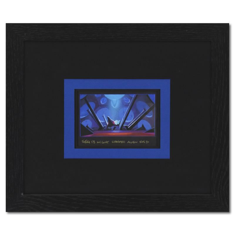 Seq 13 Night Crashed Alien Ship by Marvel Comics Original. Please see photos and description for all available information. "Seq 13 Night Crashed Alien Ship" is an original story board production painting on paper from the Marvel animated series Avengers: Earths Mightiest Heroes. This piece comes framed and includes Letter of Authenticity. Measures approx. 12.5" x 10.5" (frame), 5" x 4" (image).