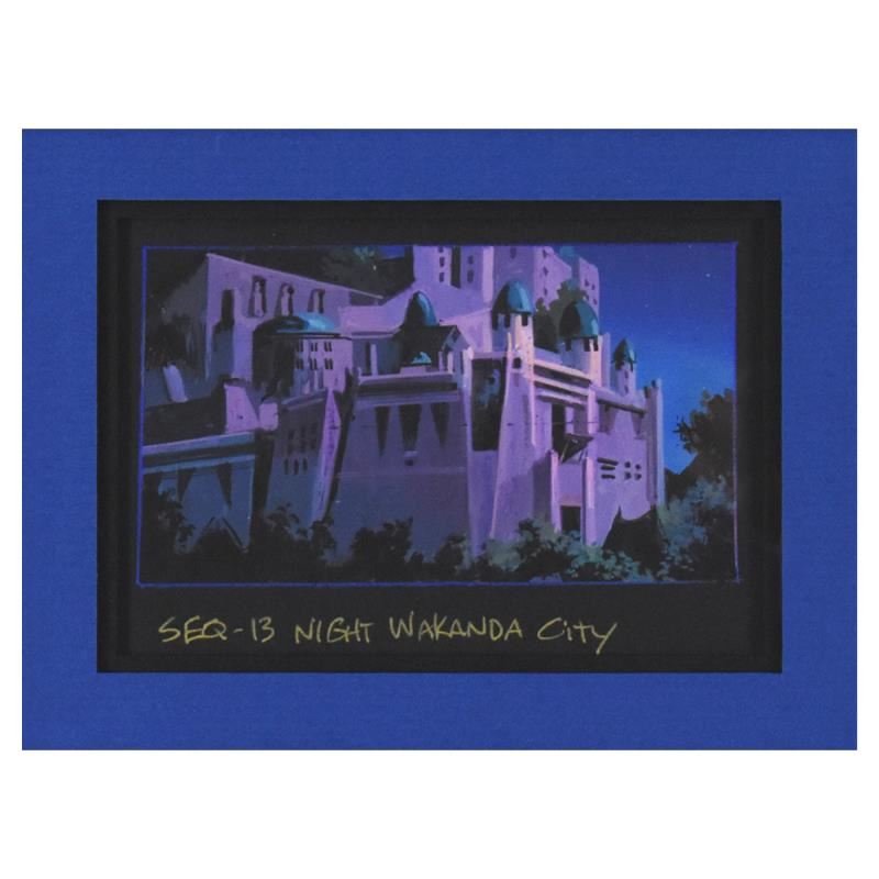 "Seq 13 Night Wakanda City" is an original story board production painting on paper from the Marvel animated series Avengers: Earth's Mightiest Heroes. This piece comes framed and includes Letter of Authenticity. Measures approx. 12.5" x 10.5" (frame), 5"