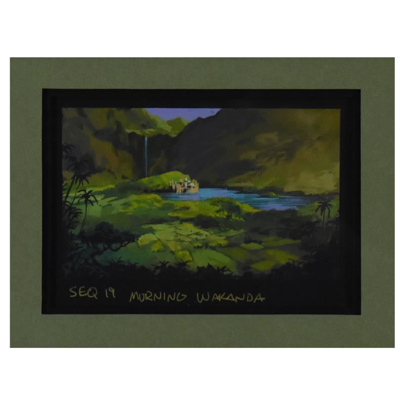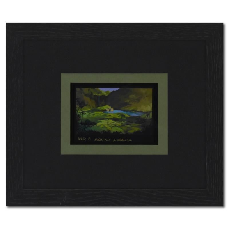 "Seq 19 Morning Wakanda" is an original story board production painting on paper from the Marvel animated series Avengers: Earth's Mightiest Heroes. This piece comes framed and includes Letter of Authenticity. Measures approx. 12.5" x 10.5" (frame), 5" x 4" (image).
