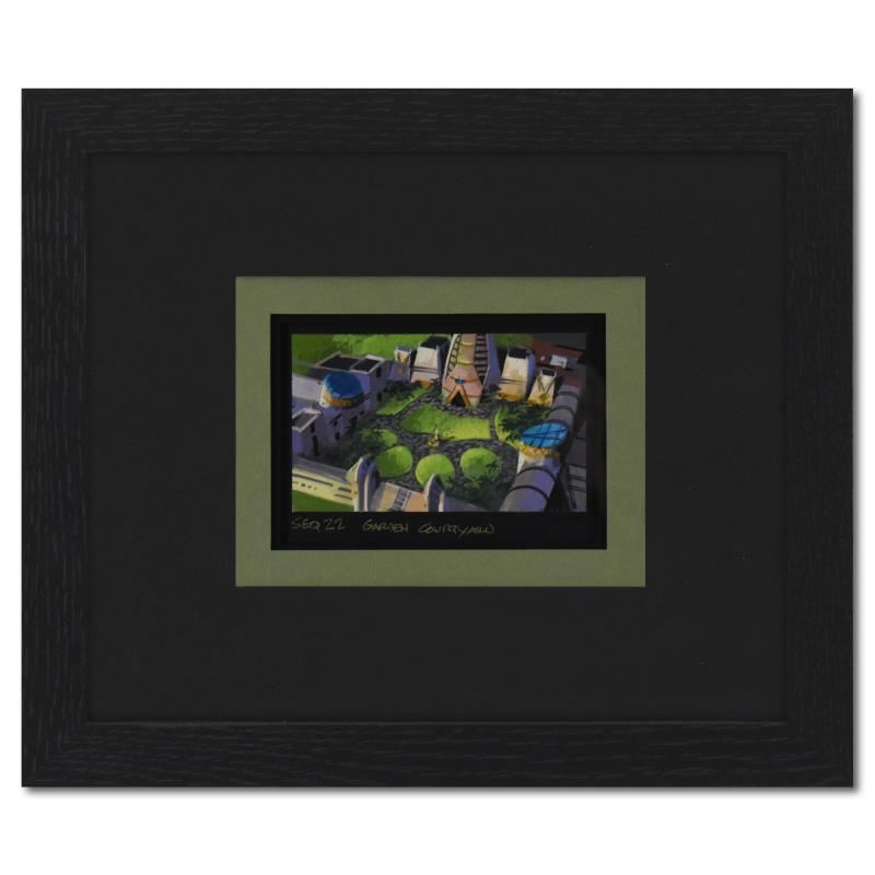 Seq 22 Garden Courtyard By Marvel Comics Original. "Seq 22 Garden Courtyard" is an original story board production painting on paper from the Marvel animated series Avengers: Earth's Mightiest Heroes. This piece comes framed and includes Letter of Authenticity. Measures approx. 12.5" x 10.5" (frame), 5" x 4" (image).