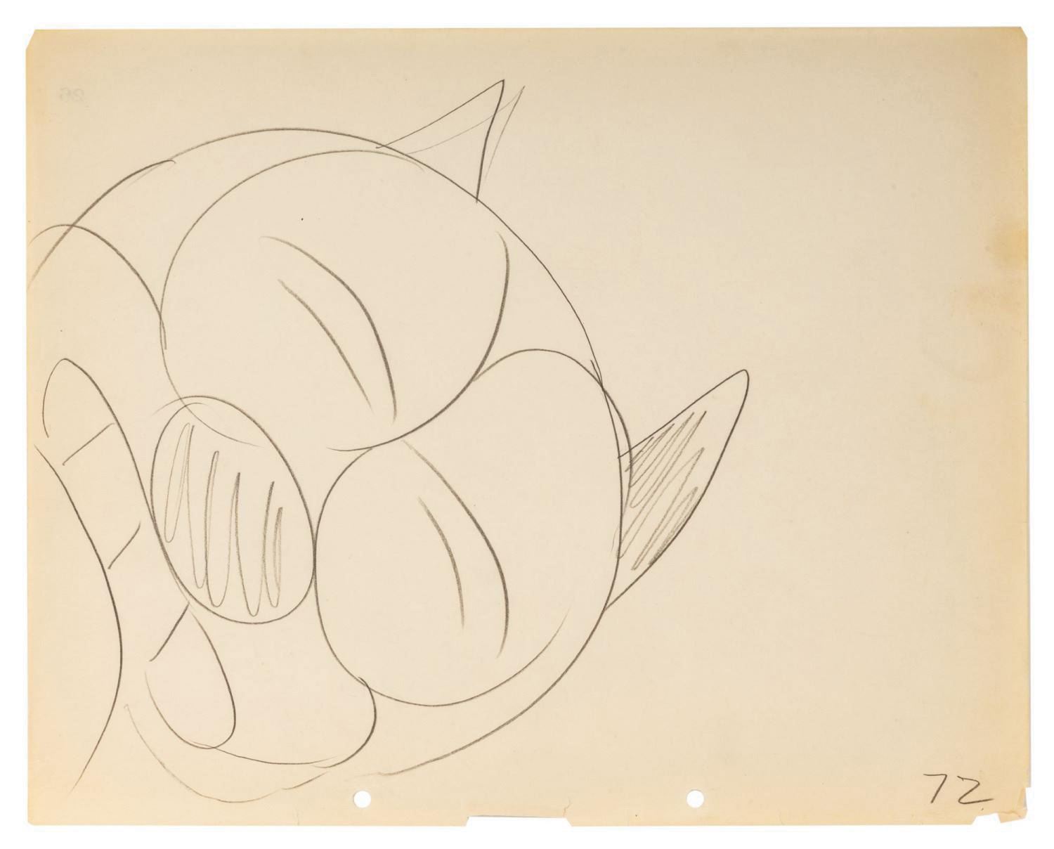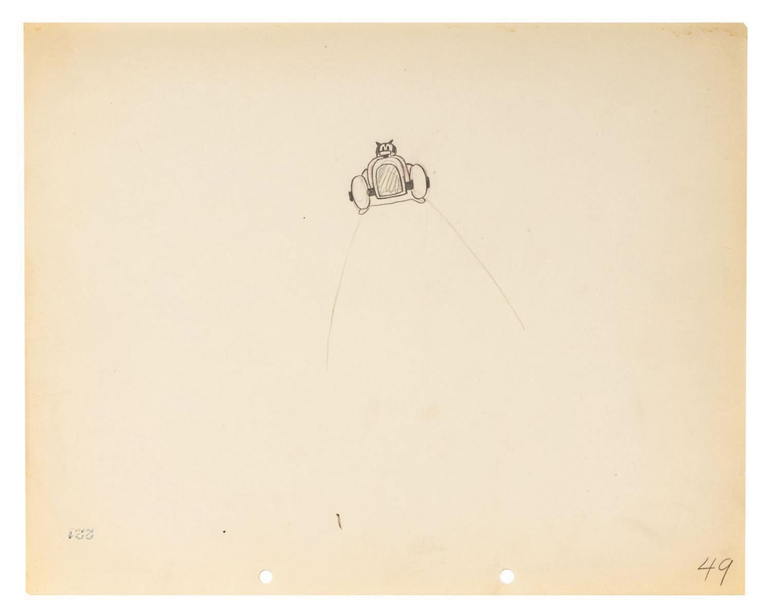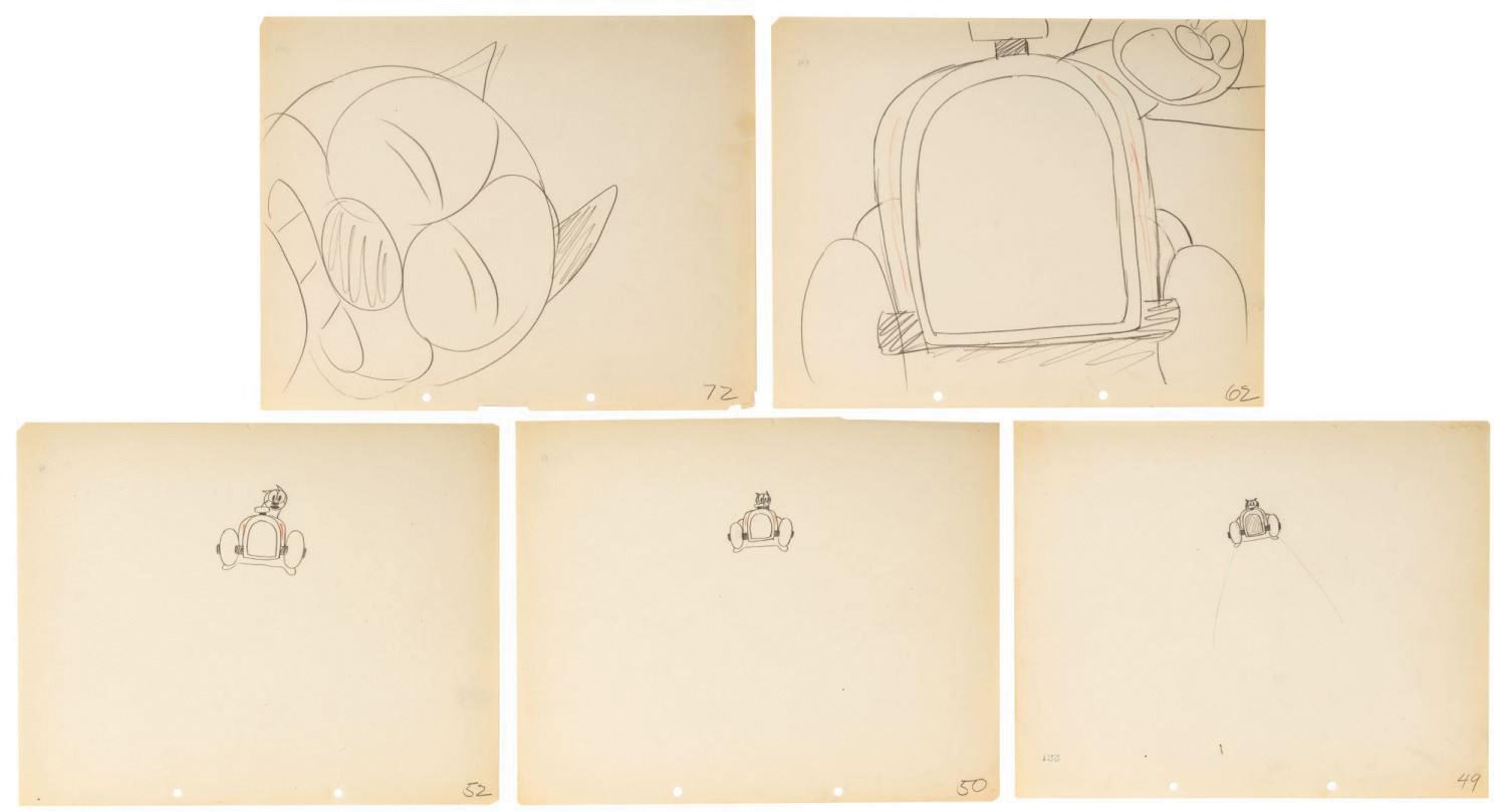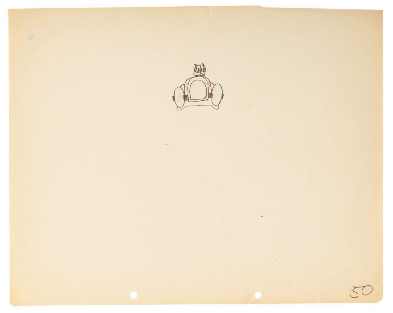 (Disney, 1928) A sequence of (5) Ub Iwerks' production drawings from "Plane Crazy," the first Mickey Mouse short. "Plane Crazy," a silent film, was tested before an audience in May of 1928, making it the first official appearance of Mickey Mouse. The short received a tepid response and Walt went back to the drawing board. With the later advent of synchronized sound, and the subsequent success of "Steamboat Willie" in November 1928, "Plane Crazy" was re-released with sound in March 1929 to greater success. The point-of-view drawings of this sequence depict the driver of an automobile caught unaware by Mickey's out-of-control barnstorming antics. Each piece ranges in image size from 1.25"x1.5" to 11.75"x9.5" on its 9.5"x12" animation paper. It is in very good condition, exhibiting mild color toning from age, a few creases, and minor wear.