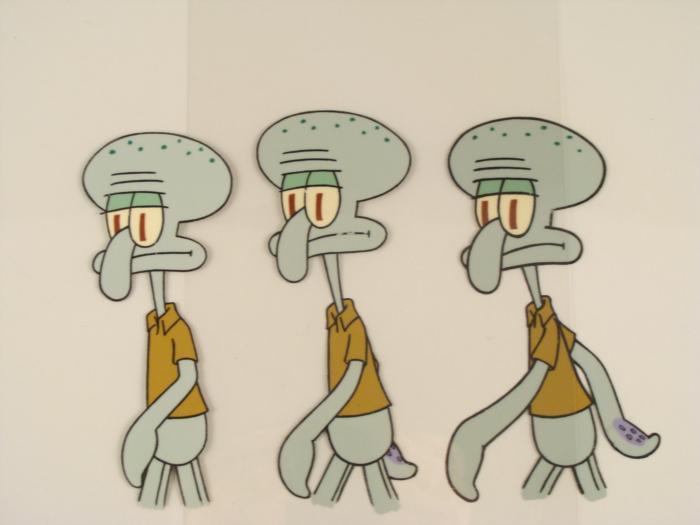 This original animation cel is from the Nickelodeon TV show SpongeBob Squarepants. The story takes place under the deep blue sea in Bikini Bottom, where SpongeBob resides. SpongeBob, who is a yellow, porous sponge, is your typical happy-go-lucky character, as he is always cheerful and enjoys making people laugh. Patrick Star, SpongeBob's neighbor who is a starfish, is your average children's show idiot, as he boasts knowing nothing and is often getting himself into ridiculous situations. Between the homes of these two lies the home of the miserable Squidward, a squid, who is known for being grouchy and playing tricks on SpongeBob and Patrick. Both SpongeBob and Squidward work at the Krusty Krab, a fast food business run by the greedy money-loving Mr. Krabs, a crab, the arch rival of the evil, possibly misunderstood, Plankton. Another neighbor, Sandy Cheeks, an athletic squirrel who normally wears an astronaut's space suit, was introduced in "Tea at the Treedome." She spends most of her time inventing and experimenting. Squidward is walking.Original Production Animated Cel Overall Size of Cel: 10 1/2" x 12 1/2" Very Good ConditionThis is an original hand-painted cel set-up used in the production of an episode of "SpongeBob SquarePants." Each one-of-a-kind set-up represents a slight change in position of the characters. When individually photographed and projected in rapid succession, the images appear to move.