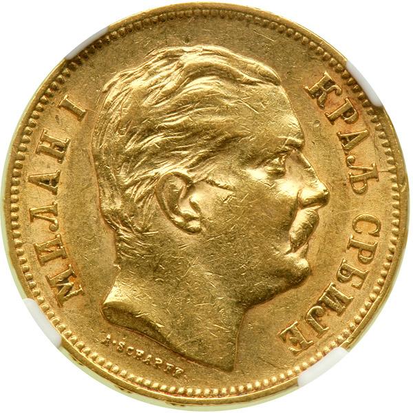 Serbia. 20 Dinara, 1882-V. Fr-4; KM-17.1 Type 1. Milan Obrenovich IV, 1868-1889. Head right. Reverse: Value. NGC graded AU-53.