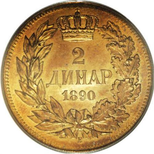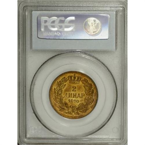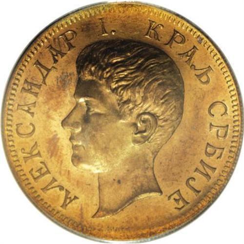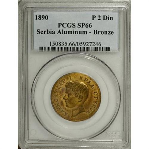 <B>Kingdom. Alexander I pattern 2 Dinara 1890-E,</B></I> KM-Pn4, again signed by Lauer, struck in aluminum bronze alloy, SP66 PCGS, a gorgeous and brilliant mate to the 1 Dinar piece. This is so rare that Krause assigns no value, just a dash. Bid accordingly!<BR><BR><b>Shipping:</b> Coins & Currency (<a target="_blank" href="http://www.heritageauctions.com/common/shipping.php">view shipping information</a>)