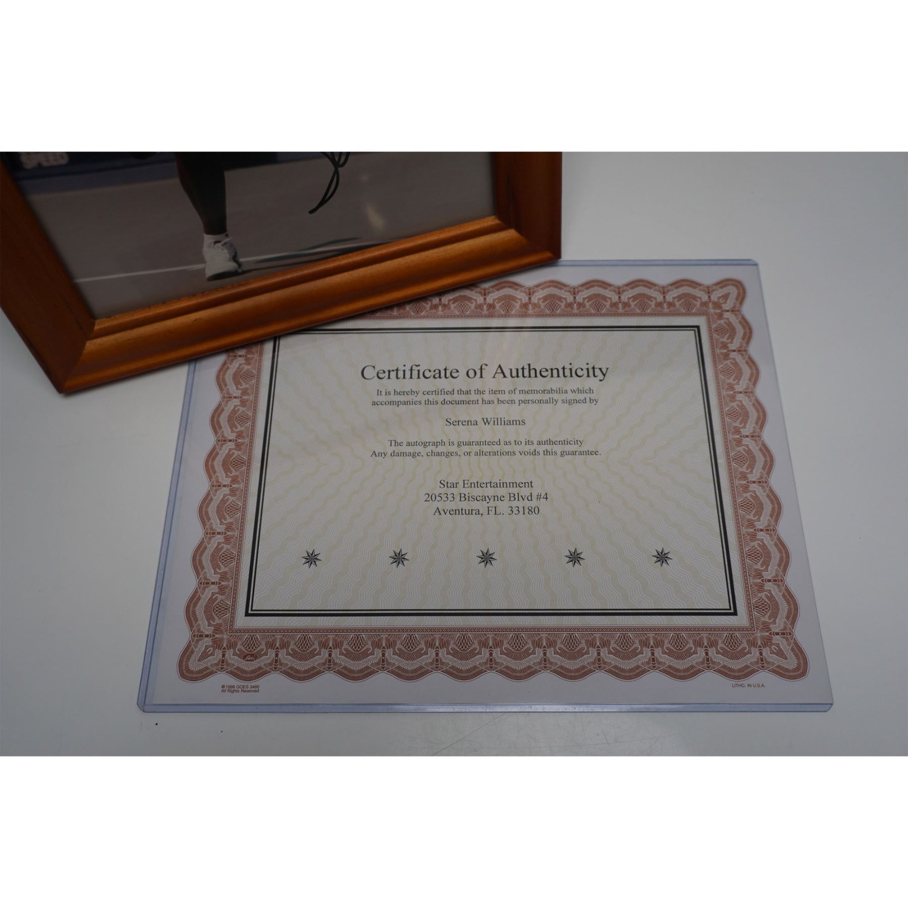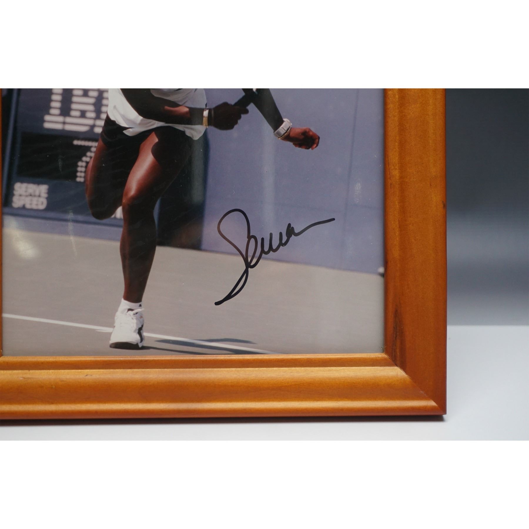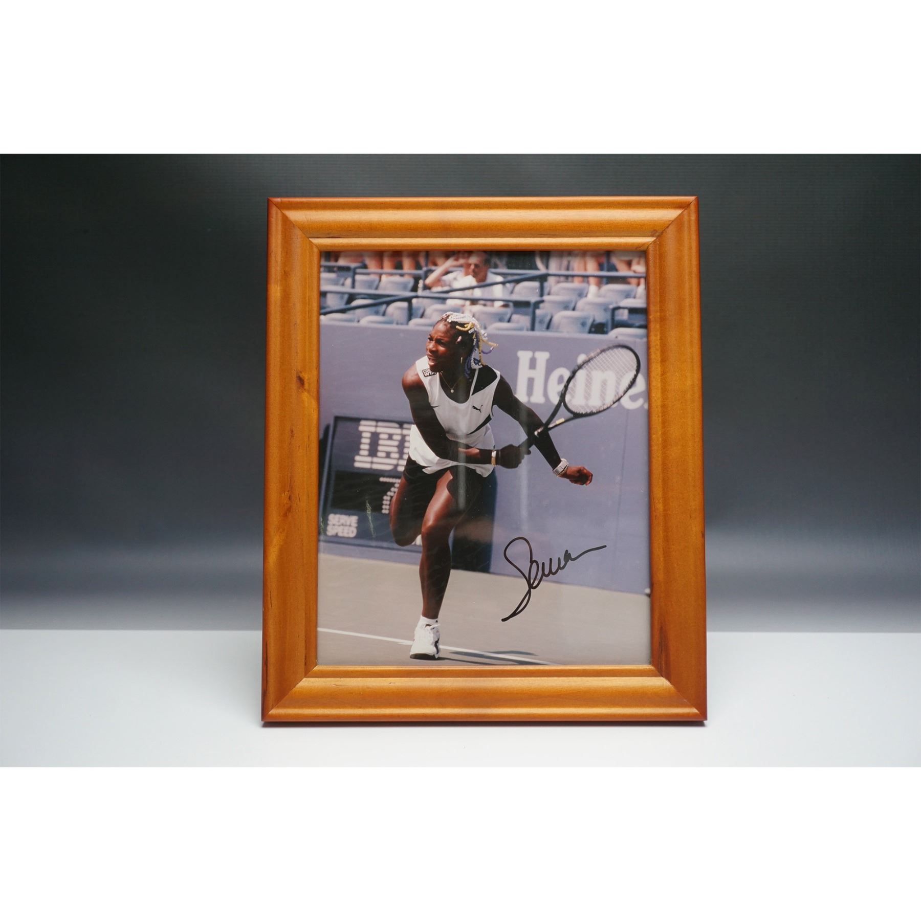 Framed action photograph of Serena Williams competing at the 1998 US Open, where she defeated Nicole Pratt. The image captures Williams in mid-stretch during the match, wearing her iconic white Puma outfit. The photograph is personally signed by Serena Williams in bold black ink and is accompanied by a Certificate of Authenticity from Star Entertainment. Housed in a wooden frame measuring 10"L x 12"H, this piece is a must-have for tennis enthusiasts and collectors of sports memorabilia.
