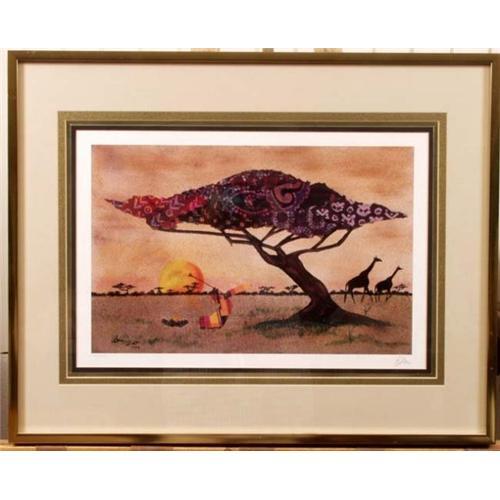Title: Serenade to the Rising<p>Artist: Listed Artist Alonzo Saunders<p>Circa: Contemporary, 1996<p>Medium: Limited Edition Lithograph<p>Art Size: 14" x 20"<p>Frame: 24" x 30", Metal frame, under glass and double matted.<p>Condition: Artwork is in very good condition. Frame will show surface marks<p>Signature: Signed in pencil by artist lower right corner, Numbered 142/650<p>Notes: African sunset with a large Poincianna tree. The tree has been given an unusual treatment, similar to a quilt.<p>BIOGRAPHY: Alonzo Saunders paints on canvas using a variety of media including acrylic, oil, pastel, and fabric. Noted for its distinctive style and versatility, his eclectic work reveals his sensitive nature and his spiritual depth. Alonzo feels that the freedom and artistic expression of the African American soul are portrayed in his creations.<p>Alonzo has participated in many national and private shows sponsored by collectors of his work. Former Governor of Virginia, L. Douglas Wilder received the original painting entitled Graduate...The Educated Black Man. His original piece, My Beloved Son, was commissioned by The Basilica of St. Mary of the Immaculate Conception, an historical African American church in Norfolk, VA. Most recently his print, Black Freedom, was selected to decorate the set on the hit television series "The Bernie Mac Show" which can be seen on FOX.<p>Alonzo was selcted by One Hundred Black Men of America, Inc. as a recipient of the Men of Distinction Star Awards for ...
