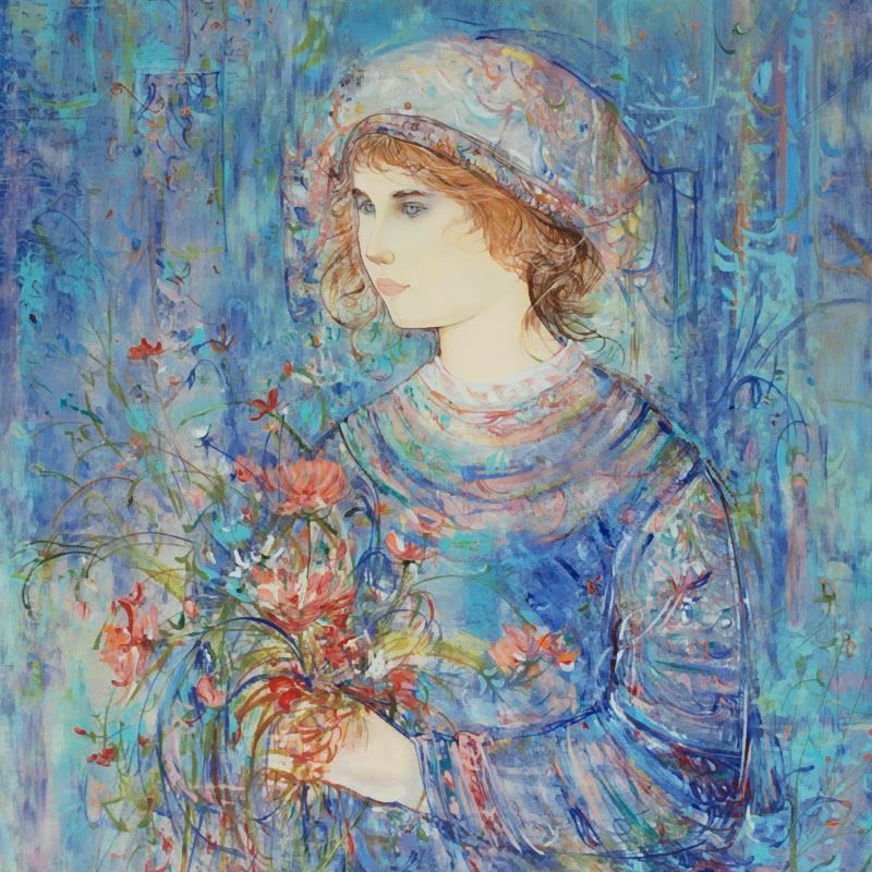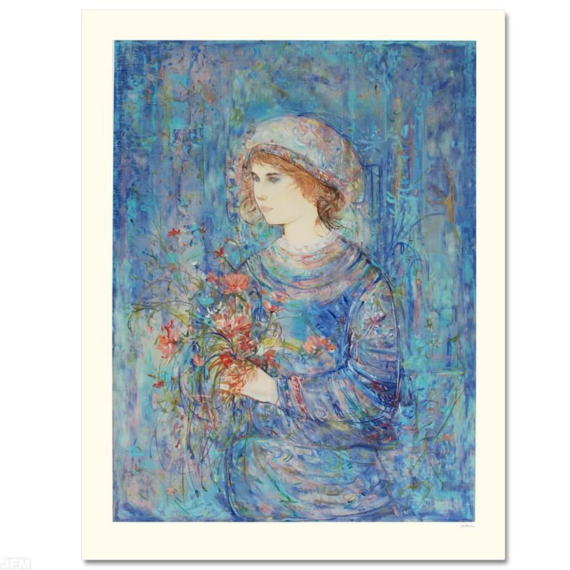 "Serene" is a limited edition serigraph on paper, numbered and hand signed by Edna Hibel (1917-2014). Includes Certificate of Authenticity! Measures approx. 32" x 41" (with border), 27" x 36" (image).3241