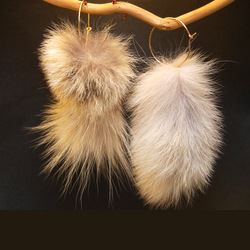 Metal: GoldCoyote fur on hammered hoops, about 4" long (hoop is about 1-1/4" diameter).Fur dangle is removable, so you can purchase other fur and feather dangles for a variety of looks. Available in either 14K gold-filled, rose gold-filled, or sterling silver. All jewelry is entirely handmade in our studio in New York.
