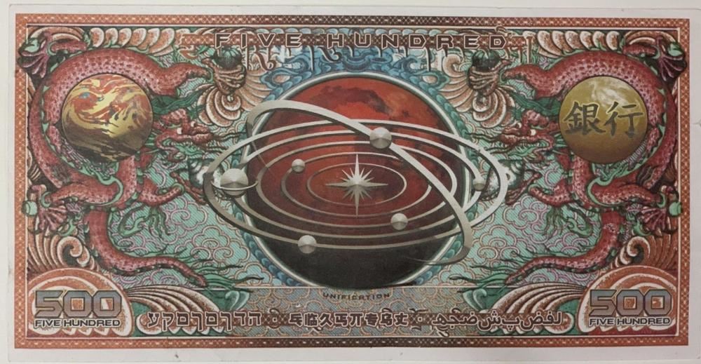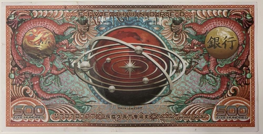 Original 500 bank note used in the production of the Joss Whedon created science fiction action film "Serenity" (2005), where the crew of the ship Serenity try to evade an assassin sent to recapture one of their members who is telepathic.