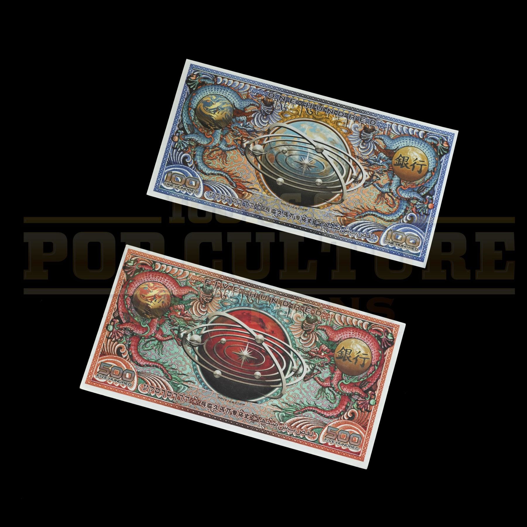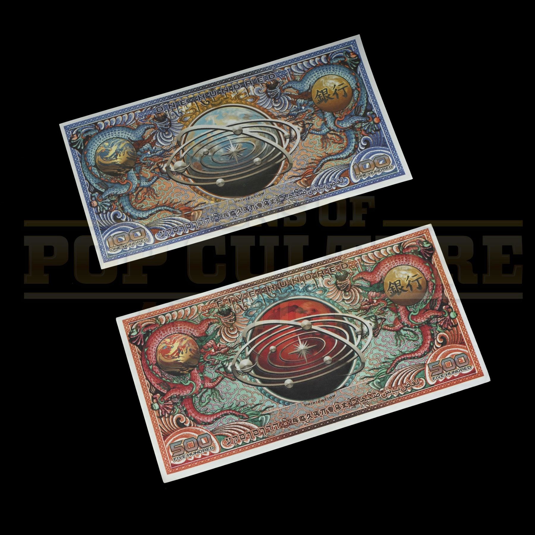 These prop bank notes were custom printed by the production for use by various actors and as set dressing. Each bank note measures 8” x 4” and are printed on both sides, one in the one hundred dollar denomination and the second in the five hundred dollar denomination.