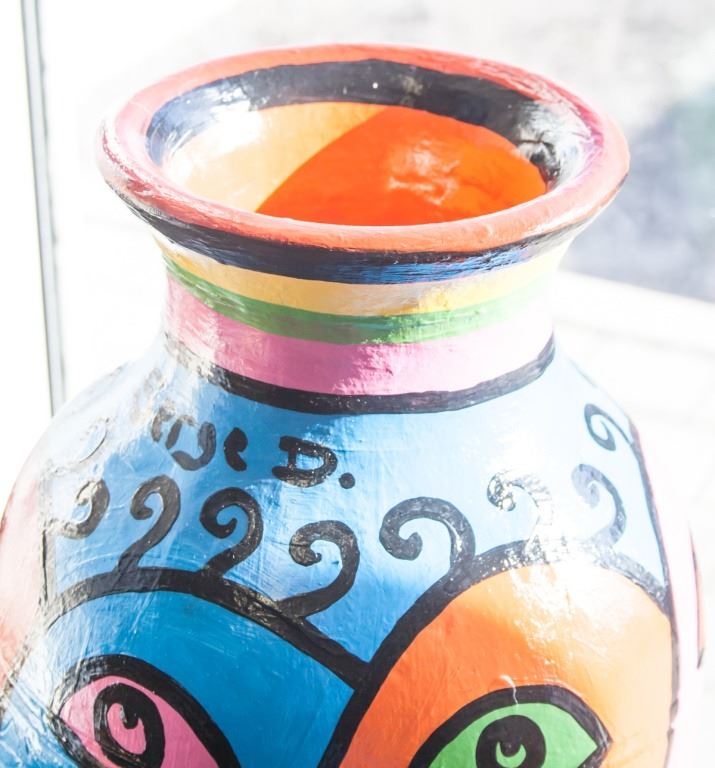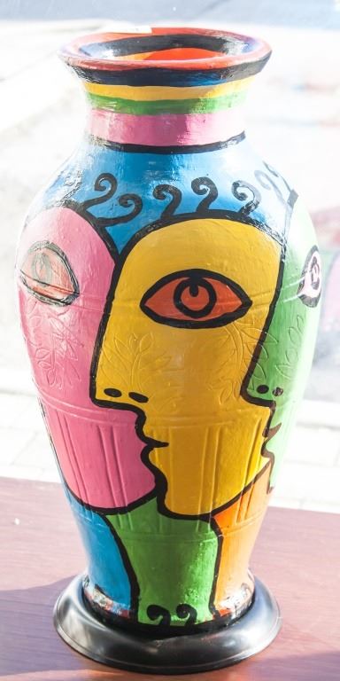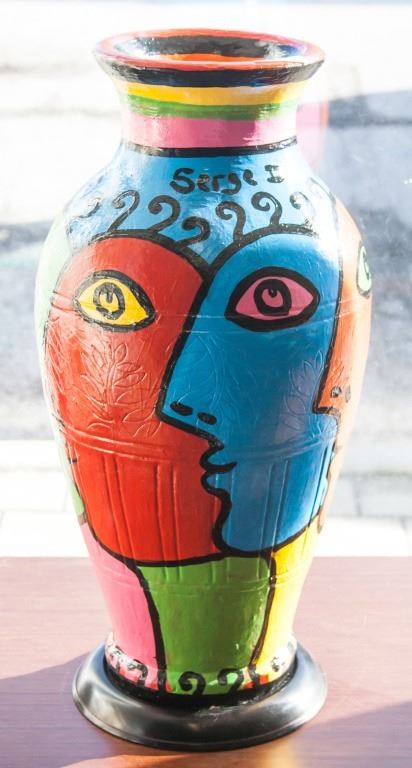 Canadian porcelain vase. Painted with surrealist faces in bold colors. Signed "Serge D." below the neck of the vase. Created by Serge Deherian (Canadian, b. 1955). Provenance: from the artist. 52 x 25 cm, 7kg.