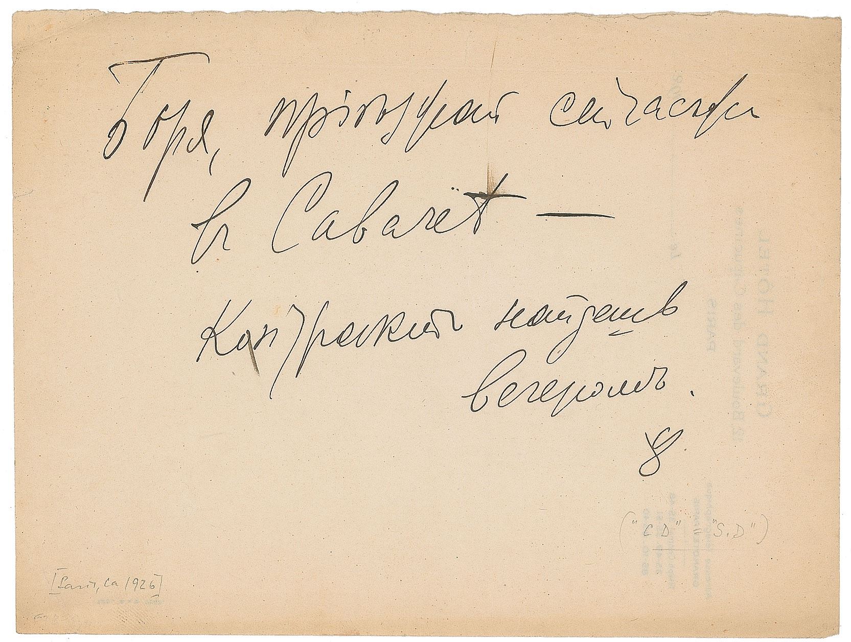 Russian ballet impresario and founder of the Ballets Russes (1872–1929). Vintage fountain pen signature and inscription in Russian, signed with his initials "S. D.," on the reverse of an off-white 7.25 x 5.5 sheet of stationery from the Grand Hotel in Paris. In fine condition, with creasing to the top.