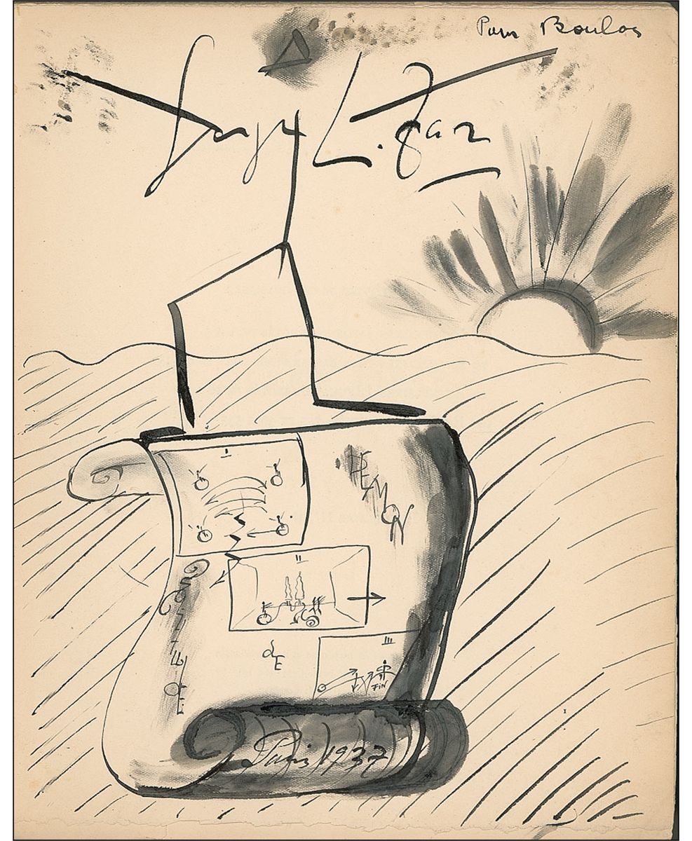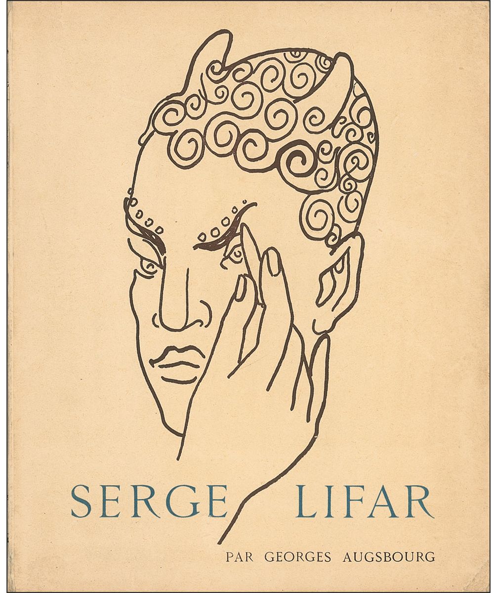 Ukrainian-born dancer and choreographer (1905–1986) who takes a place among the most esteemed figures in twentieth-century ballet. Signed book: La Vie en Images de Serge Lifar. Paris: R. A. Correa, 1937. Softcover, 9 x 11. Gorgeously signed in fountain pen on the first free-end page, Lifar adds a full page, original ink drawing of a scroll bearing three smaller sketches of dancers and choreographic directions, set against a mountain and setting sun, dated Paris, 1937. In very good condition, with light toning, some mild smudging to the signature page, mirroring to the reverse side of the front cover, the front hinge loose, but intact, and some mild creasing to the covers and spine.