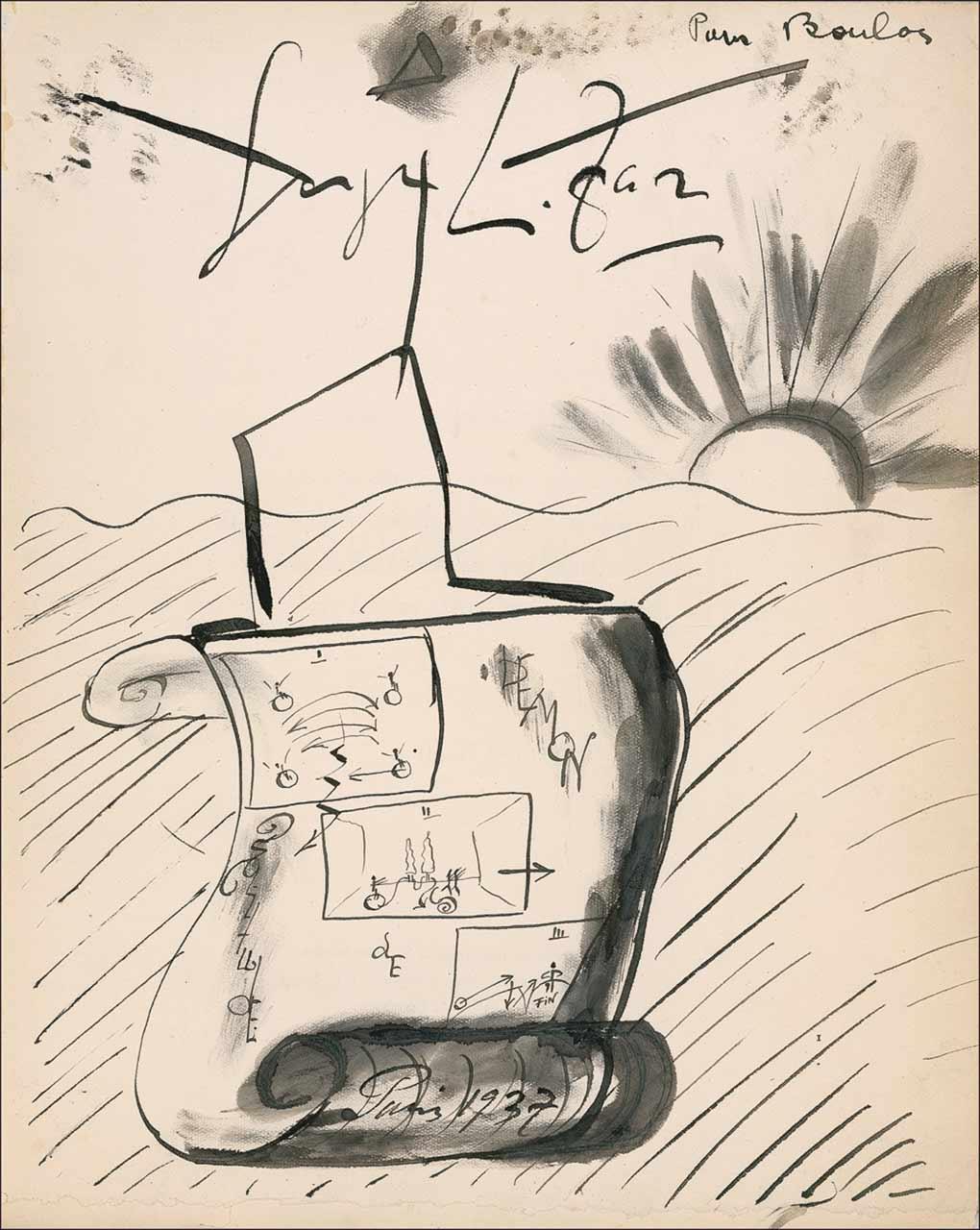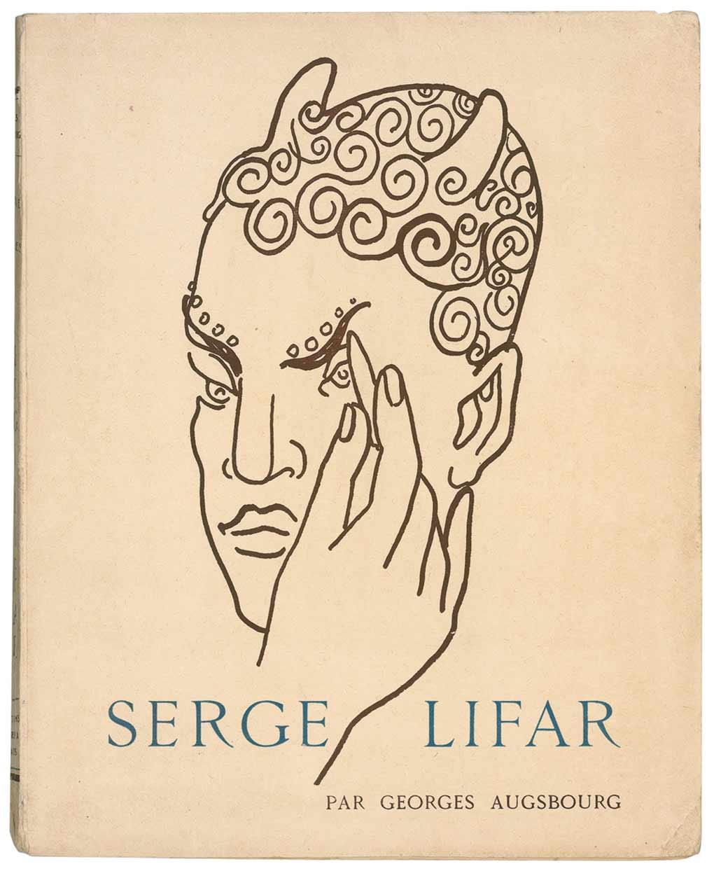 Ukrainian-born dancer and choreographer (1905–1986) who takes a place among the most esteemed figures in twentieth-century ballet. Signed book: La Vie en Images de Serge Lifar. First edition. Paris: R. A. Correa, 1937. Softcover, 9 x 11. Signed in fountain pen on the first free end page by Lifar, who adds a remarkable full page original sketch of a scroll bearing three smaller sketches of dancers, set against a mountain and setting sun, dated Paris 1937. In fine condition, with some light mirroring of sketch to inside front cover, rough bottom edge of signed page, some moderately heavy creasing to spine, and a bit of scattered light soiling and creasing to covers.
