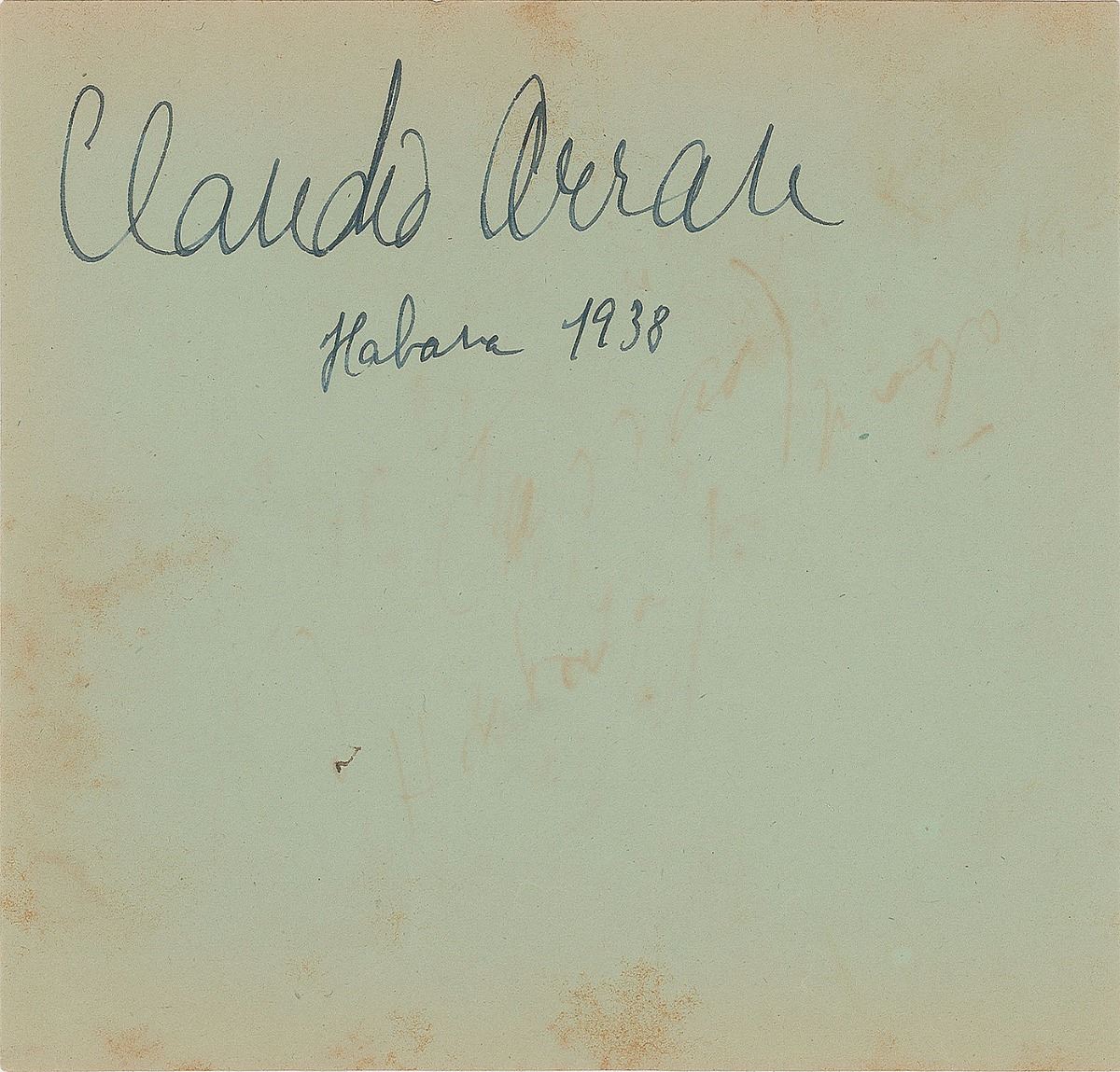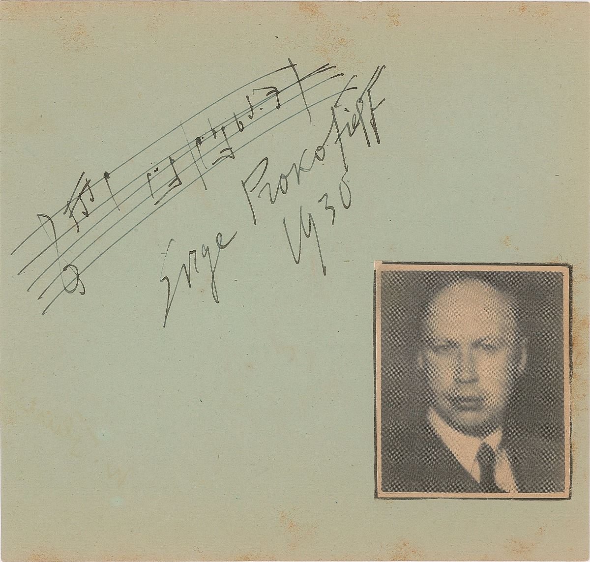 Scarce two-bar AMQS on a light green 5.5 x 5.25 album page, signed below in fountain pen, "Serge Prokofieff, 1930." Also signed on the reverse by pianist Claudio Arrau. In fine condition, with foxing to edges.