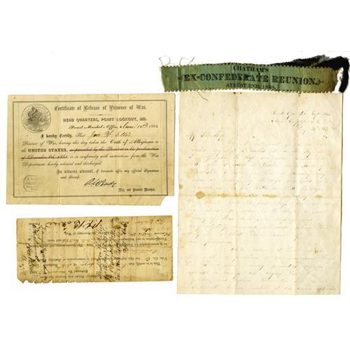 <B>Sergeant John W. Ellis, Company E, 26th North Carolina CSA: Handwritten Letter Home About Gettysburg, His Parole and Sick Leave Document, and Reunion Patch.</B></I> A handwritten signed letter from Sergeant John W. Ellis of the 26th North Carolina Confederate Infantry, this document is dated July 25, 1863. Writing to his wife just after the Battle of Gettysburg, Sergeant Ellis details the loss of men in his regiment during the battle. With 588 men lost on the first day at Gettysburg, the unit regrouped for the third day charge that would make history. Confederate Major General George Pickett ordered the men from the 26th North Carolina into battle at the 'Bloody Angle.' Ellis' unit would make the farthest advance planting their colors in the Federal Works - but with the highest casualty rate of any unit. The 26th would go on to fight at The Wilderness and Petersburg before surrendering at Appomattox with General Lee.<BR><BR>The letter is approximately 8" x 10" and is handwritten front and back of the sheet. In the letter addressed to his wife, Ellis tells how the 26th faced off against the famed 'Iron Brigade' in battle. Ellis had enlisted on May 28, 1861 at Cartersville in Chatham County, North Carolina. He had seen the horrors of war but somehow could write to his wife in this letter about a magazine subscription as well.<BR><BR>Accompanying the letter is the original parole of Ellis dated June 12, 1865. Of the almost 1,200 men that had signed up with the 26th North Carolina only 120 would live through the war to be paroled. This 8" x 5.375" "Certificate of Release of Prisoner of War" is in good condition with a slight tear at the bottom right. On verso is the signed declaration by Ellis that he will support the Union. A physical description notes that Ellis was 5' 8" tall with brown hair, blue eyes and a light complexion.<BR><BR>Another document included with this group is a 7.5" x 3.375" medical furlough for Ellis. Dated August 24, 1862, the furlough allows Ellis to travel back to North Carolina for a period of thirty-five days to recoup from a 'continued fever.' With some foxing, the document contains information about the furlough on the front and back. <BR><BR>The survivors of the 26th continued to meet after the war. With this grouping is Ellis' "Chatham's Ex-Confederate Reunion August 22, 1888" ribbon. At 8.5" x 1.25" the reunion ribbon is made of green silk with block stenciled letters.<BR><BR>The documents and letter are contained in a gray hardbound volume with gold engraved lettering. This is a unique set of personal and official documents chronicling this soldier from a spectacular unit and his life. <BR><BR><b>Shipping:</b> Small Collectibles (<a target="_blank" href="http://www.heritageauctions.com/common/shipping.php">view shipping information</a>)