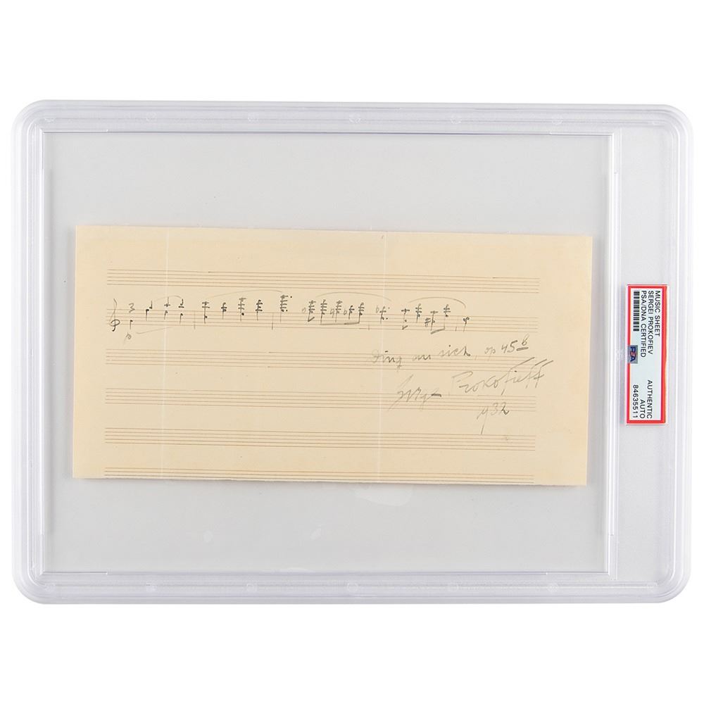AMQS in fountain pen on an off-white 10 x 5 musically lined sheet, signed below, "Serge Prokofieff, 1932," who writes four bars of music from ‘Ding an sich,’ or ‘Thing-in-Itself,' an arrangement from Op. 45B. In fine condition, with two vertical folds, and faint toning from prior display. Encapsulated in a PSA/DNA authentication holder.