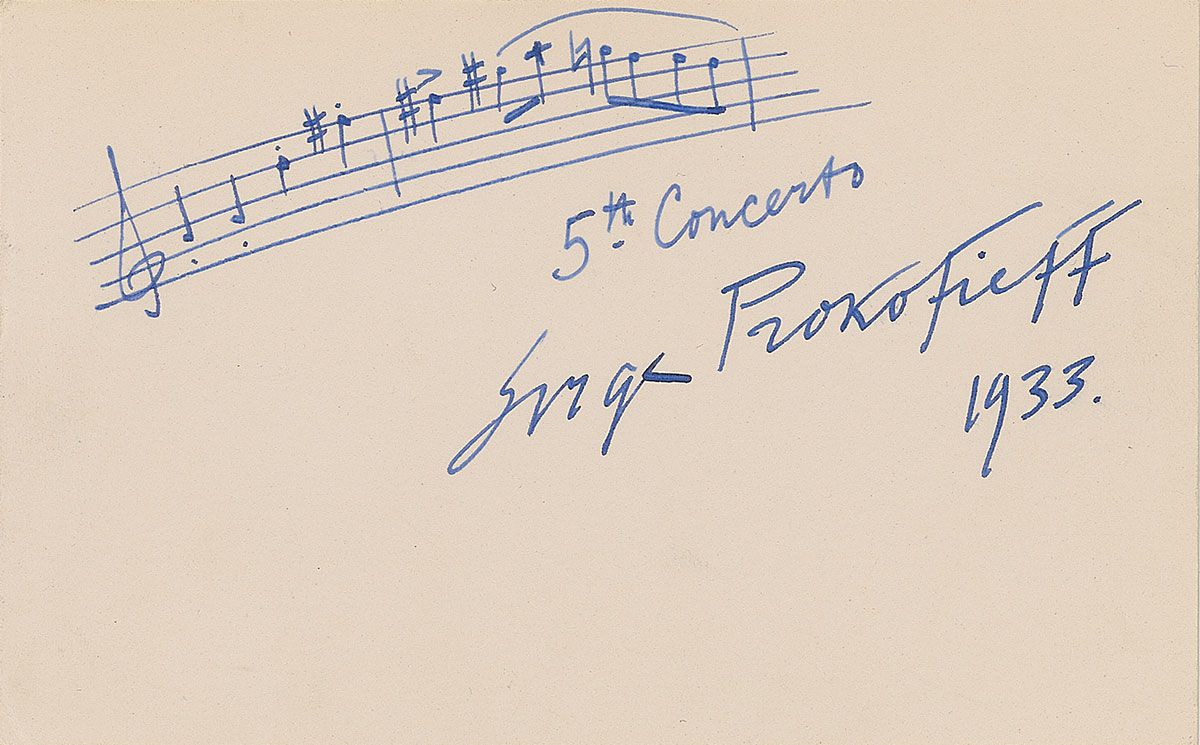 Crisply penned AMQS on a 5.25 x 3.25 off-white card. Prokofiev pens two bars from his ‘5th Concerto,’ signed underneath, “5th Concerto, Sergei Prokofiev 1933.” In fine condition. An outstanding and particularly showy example, signed just one year after its debut.