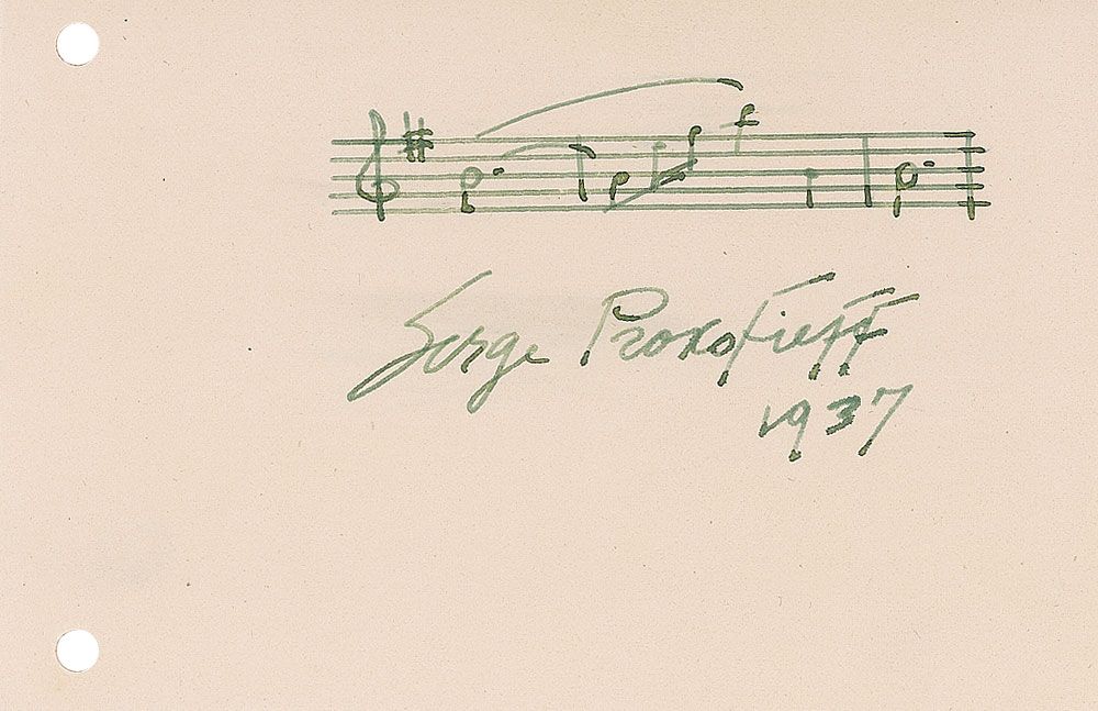 Eminent and prolific Russian composer (1891–1953) best known for his colorful, rhythmically vigorous works, including symphonies, operas, and much music for keyboard and chamber ensembles. AMQS on an off-white 5.75 x 3.75 album page, signed “Serge Prokofieff, 1937.” Prokofieff pens three bars from a work in G major. In fine condition.