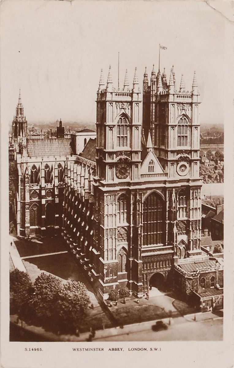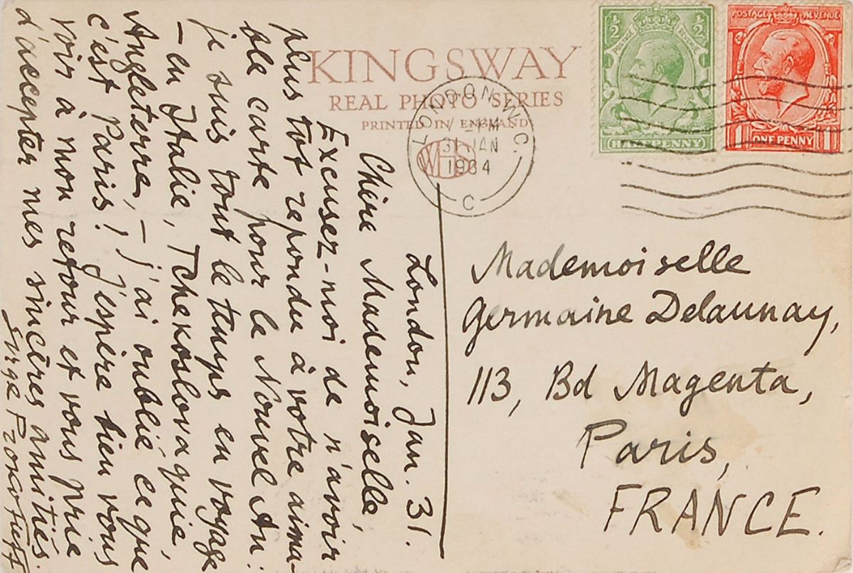ALS in French, one page on a 3.5 x 5.5 postcard depicting Westminster Abbey, January 31, 1934. Letter written to Germaine Delaunay, written from London during his European tour. In fine condition.