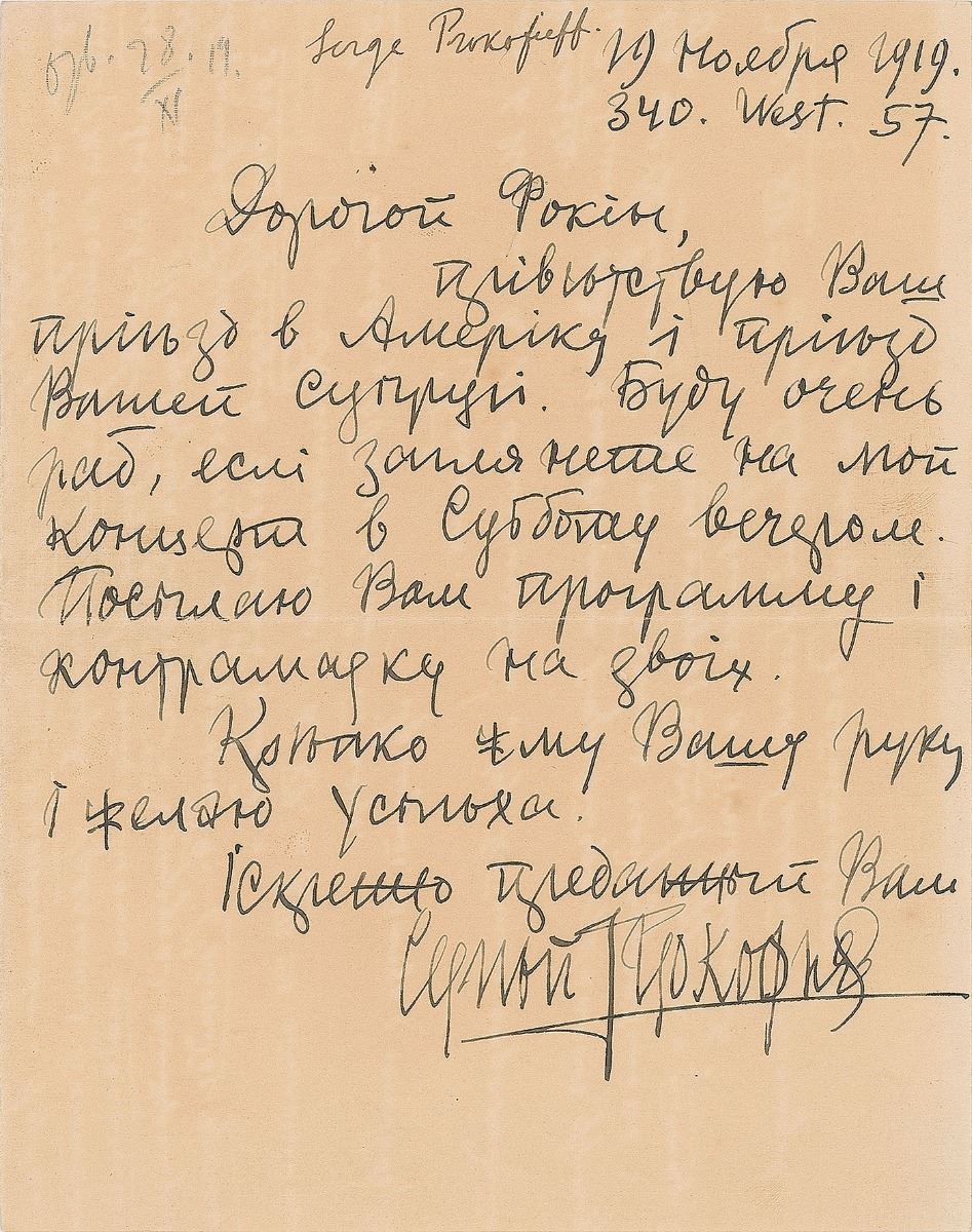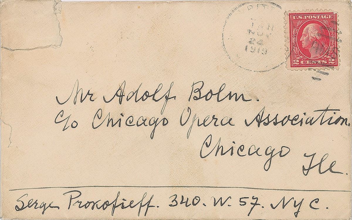 ALS in Cyrillic, one page, 5.25 x 6.75, November 19, 1919. Letter to "Dear Fokin," undoubtedly the great Russian choreographer Michel Fokine, in part (translated): "Welcome to America to you and your wife. I will be very glad to see both of you at my concert on Saturday night. I am sending you two tickets along with a concert program. Best wishes to you and good luck!" Includes an unrelated envelope addressed in Prokofiev's hand to ballet dancer Adolf Bolm, signed along the bottom in the return address, "Serge Prokofieff." In fine condition, with light mottled toning to the letter, and a torn upper left corner to the envelope.