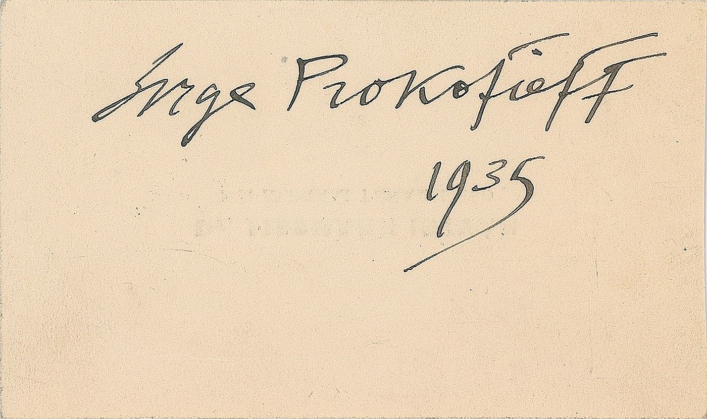 Eminent and prolific Russian composer (1891–1953) best known for his colorful, rhythmically vigorous works, including symphonies, operas, and much music for keyboard and chamber ensembles. Bold fountain pen signature, "Serge Prokofieff, 1935,” on an off-white 3.75 x 2.25 card. In fine condition, with light show-through from type on the reverse.