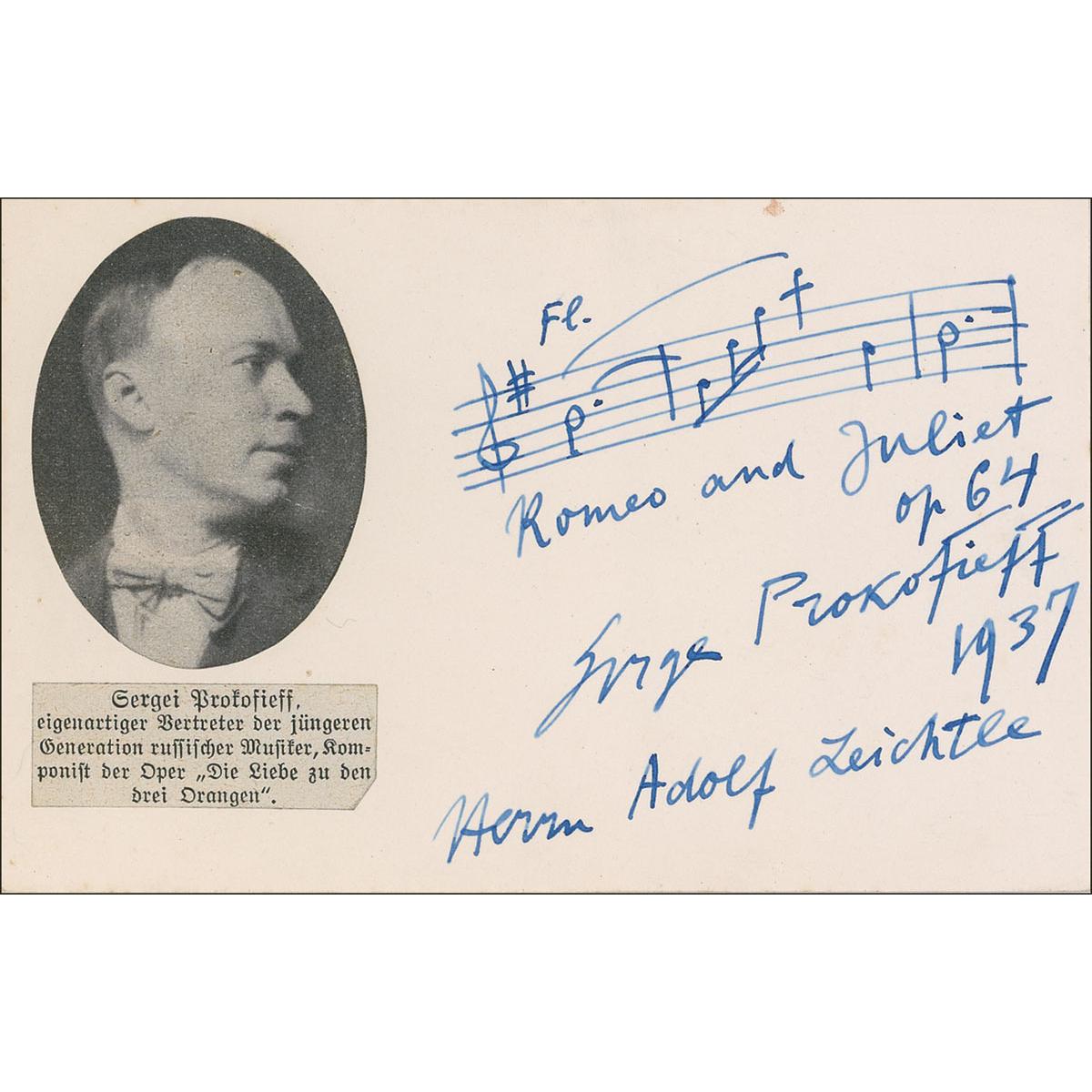 Eminent and prolific Russian composer (1891–1953) best known for his colorful, rhythmically vigorous works, including symphonies, operas, and much music for keyboard and chamber ensembles. AMQS on an off-white 5.5 x 3.5 card. Prokofiev pens three bars of music from “Romeo and Juliet op 64,” signing underneath, “Serge Prokofiev, 1937,” and adding a brief inscription. A small circular photo and caption have been affixed to the left side of card. In fine condition.