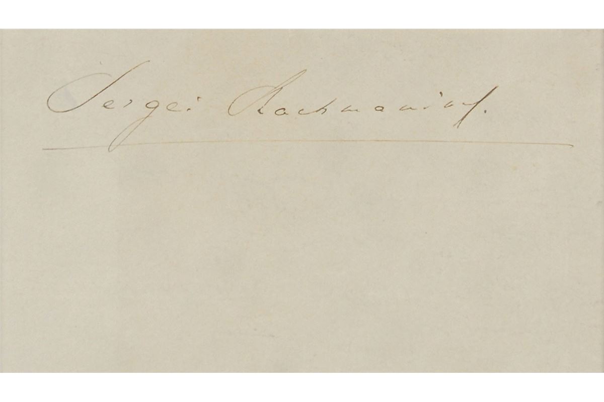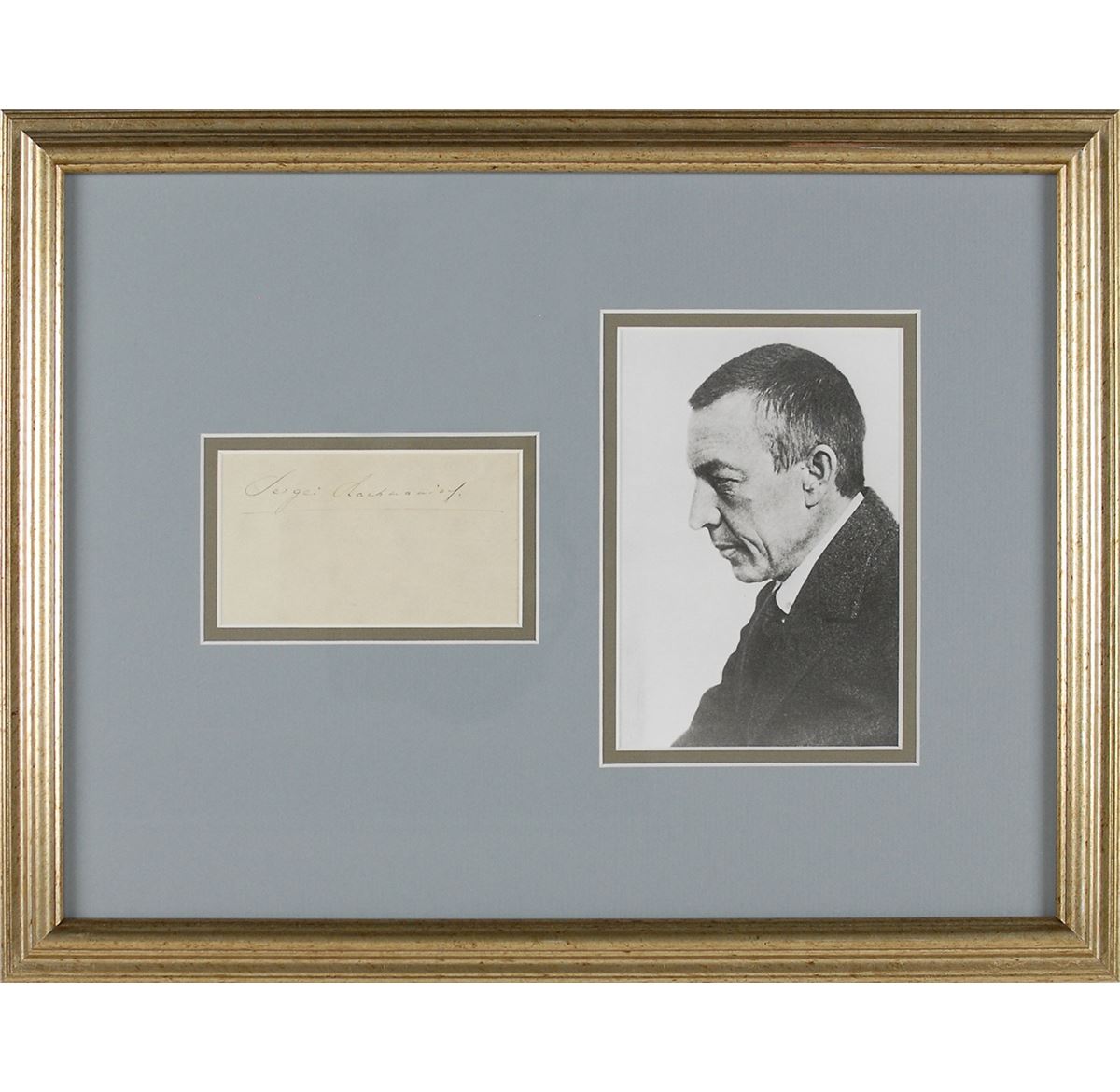 Ink signature, “Sergei Rachmaninoff,” on an off-white 4.25 x 2.5 slip. Handsomely double-matted and framed with a profile image of the Russian composer to an overall size of 16.5 x 13. In fine condition, with scattered creases and a subtle block of toning.