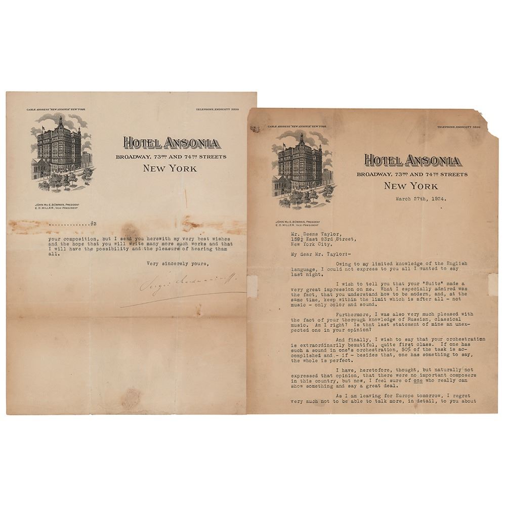 Superb TLS, two pages, 8.5 x 10.25, Hotel Ansonia [New York] letterhead, March 27, 1924. Letter to Deems Taylor, in full: "Owing to my limited knowledge of the English language, I could not express to you all I wanted to say last night. I wish to tell you that your 'Suite' made a very great impression on me. What I especially admired was the fact, that you understand how to be modern, and, at the same time, keep within the limit which is after all—not music—only color and sound. Furthermore, I was also very much pleased with the fact of your thorough knowledge of Russian, classical music. Am I right? Is that last statement of mine an unexpected one in your opinion? And finally, I wish to say that your orchestration is extraordinarily beautiful, quite first class. If one has such a sound in one's orchestration, 50% of the task is accomplished and—if—besides that, one has something to say, the whole is perfect. I have, heretofore, thought, but naturally not expressed that opinion, that there were no important composers in this country, but now, I feel sure of one who really can show something and say a great deal. As I am leaving for Europe tomorrow, I regret very much not to be able to talk more, in detail, to you about your composition, but I send you herewith my very best wishes and the hope that you will write many more such works and that I will have the possibility and the pleasure of hearing them all." In very good condition, with irregular toning and staining, and trimming and corner loss to the first page.