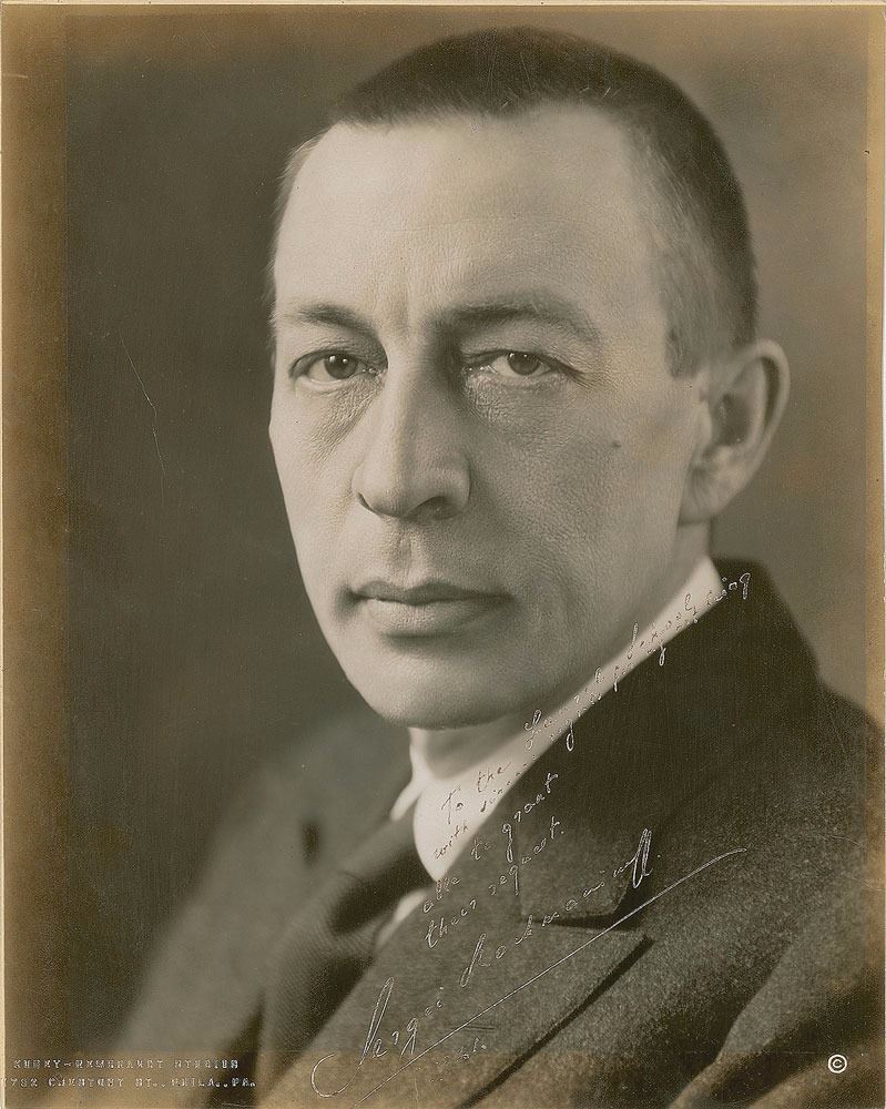 Exceptional vintage pearl-finish 7.5 x 9.25 portrait of Rachmaninoff by the Kubey–Rembrandt Studios of Philadelphia, signed and inscribed in fountain pen, "To the Laurel School, with my sincere regrets for my not being able to grant their request. Sergei Rachmaninoff.” Lower left bears the studio blindstamp, and the reverse bearing the studio credit stamp. In very good to fine condition, with trimmed edges, scattered light creasing and silvering, and flaking to the ink, not affecting readability.